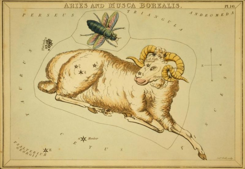 In old times of history we all see Aries and Musca Borealis: The constellation Aries the Ram. His head is turned backward, looking in the direction of the Pleaides star cluster. Please click Musca Borealis.