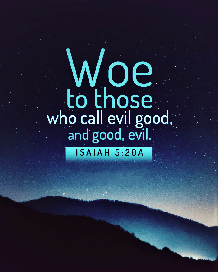 Isaiah 5:20 TLV Woe to those who call evil good and good evil,who change darkness into light and light into darkness,who change bitter into sweet and sweet into bitter!
