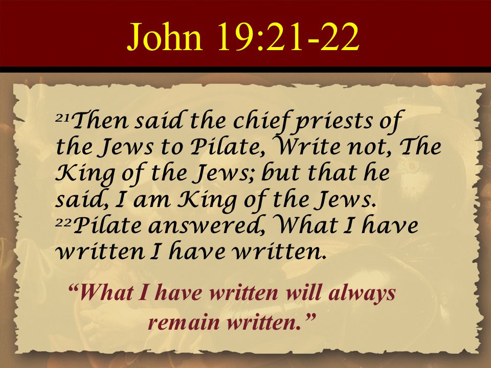 22 “What I have written, I have written,” Pilate answered.