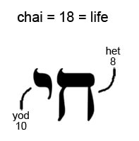 Chai refers to the number 18, because each Hebrew letter has a numerical equivalent, and the sum of chet (numerical value of 8) and yud (numerical value of 10) is 18.