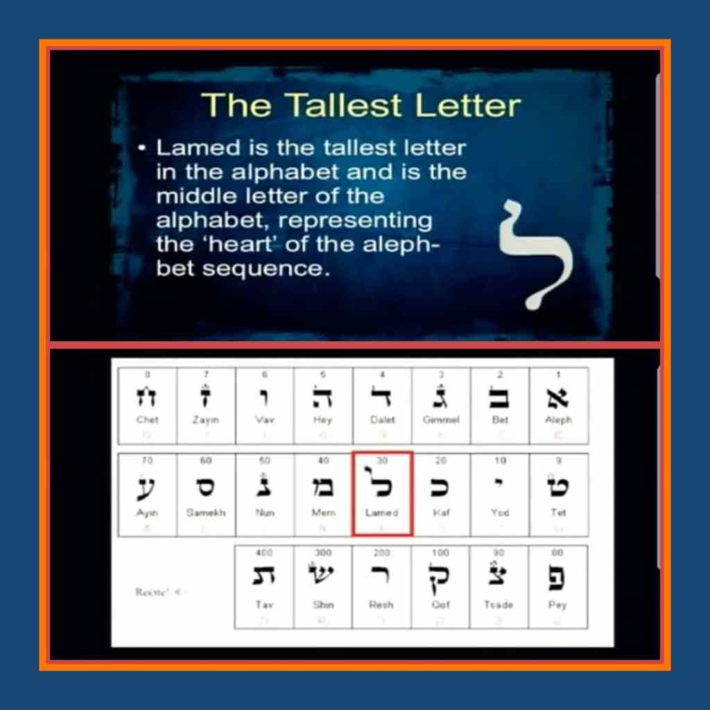 This Lamed (ל) Hebrew letter is the tallest letter of the Hebrew alphabet. Since it stands taller than all the other letters, it represents royalty. In fact, it represents the King of all kings, the Almighty.