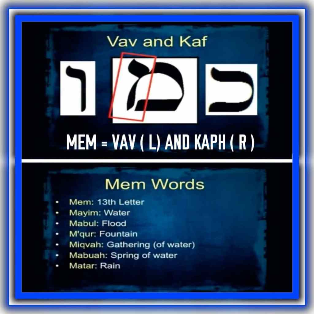 The letter Mem is the 13th letter of the Aleph-Bet, having the numeric value of 40. The pictograph for Mem looks like a wave of water, whereas the classical Hebrew script (Ketav Ashurit) is constructed of a Kaf with a Vav beside it: