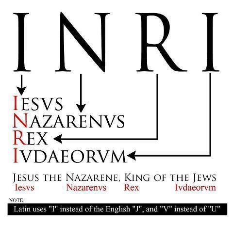 INRI” is an abbreviation for the Latin IESUS NAZARENUS REX IUDAEORUM “Jesus of Nazareth, King of the Jews.” These four letters were sometimes referred to as the sacred monogram, perhaps they originated as a kind of vague parallel to the Tetragrammaton, YHWH