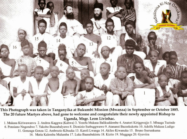 St. Charles Lwanga (top center, in front of the two European missionaries) and his companions, 19 of whom would be martyred with him eight months later, pose for a group photo in October 1885. (photo: Public Domain)