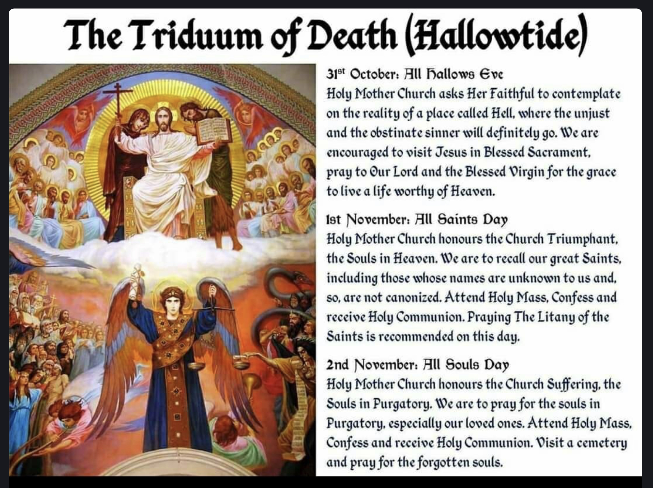 All Hallows Eve, All Saints Day, All Souls Day (The Triduum of Hallowtide).