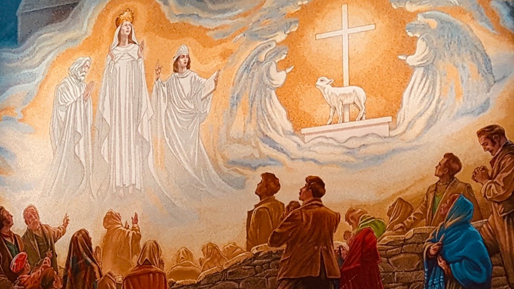 Wow! The Sanctuary of Our Lady of Knock, commonly referred to as Knock Shrine, is a Roman Catholic pilgrimage site and national shrine in the village of Knock, County Mayo, Ireland, where locals claimed to have seen an apparition in 1879 of the Blessed Virgin Mary, Saint Joseph, Saint John the Evangelist, angels, and Jesus Christ (The Lamb of God).