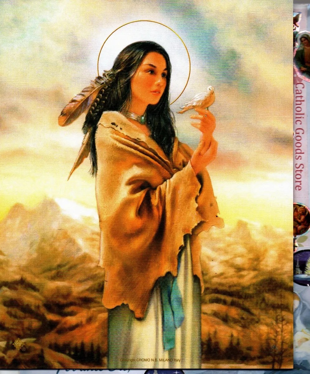 Kateri Tekakwitha (feast day April 17), the first Native American to be canonized. This humble Mohawk princess was beatified by Pope St. John Paul II in 1980 and canonized in 2012 by Pope Benedict XVI, who entrusted her with “the renewal of the faith in the first nations and in all of North America.”